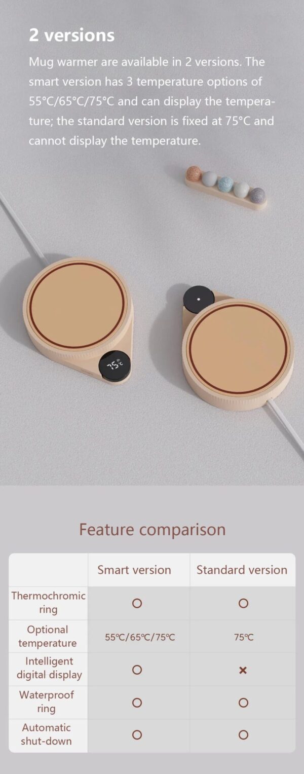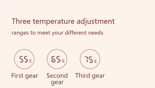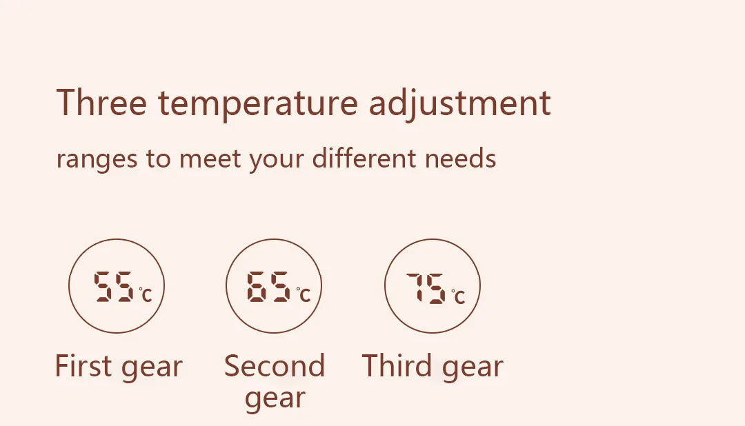 – Smart version features: 55/65/75℃ 3 temperature optional; smart digital display screen; temperature-sensitive color-changing ring; 8 hours power off protection; waterproof ring.
