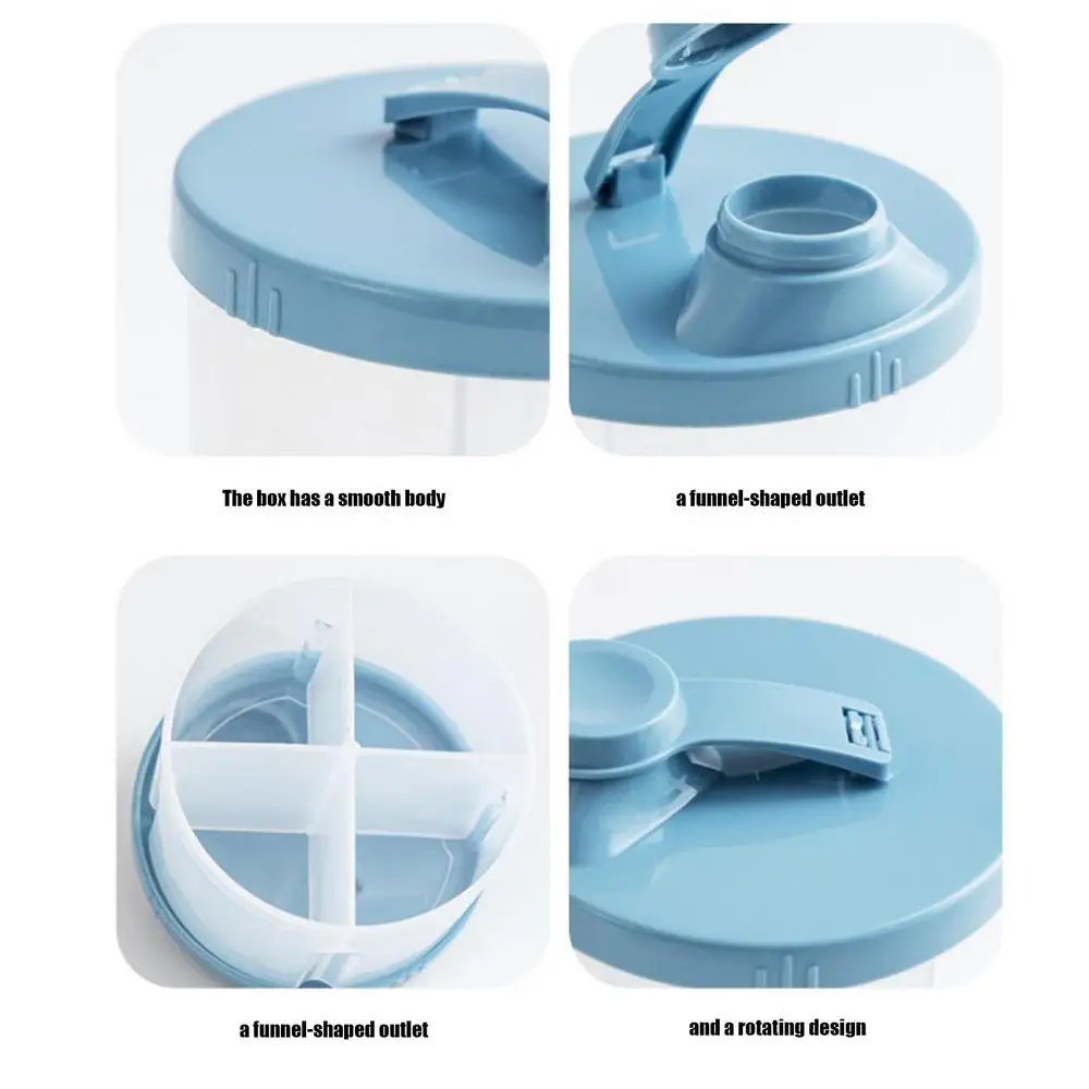 2. Rotary milk powder sub-packaging box, flat cylindrical, four compartments, convenient and fast feeding.