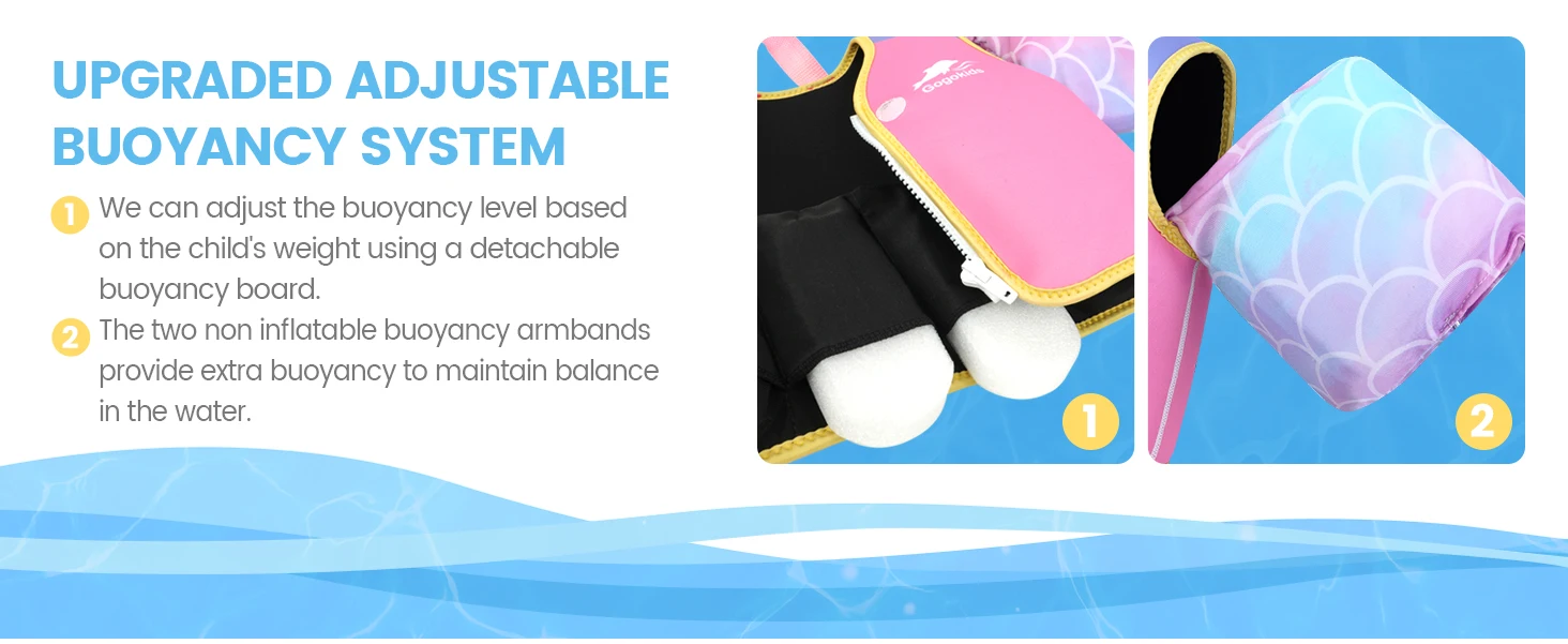 3. SUPERIOR BUOYANCY- Our swim jackets is designed to provide auxiliary buoyancy functions with 50N. Two armbands and swim vest strengthen the buoyancy together.